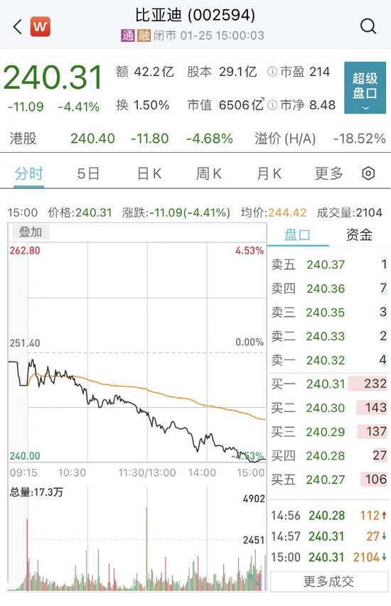 股价方面,截至1月25日收盘,比亚迪每股报240.31元,最新市值6506亿元。