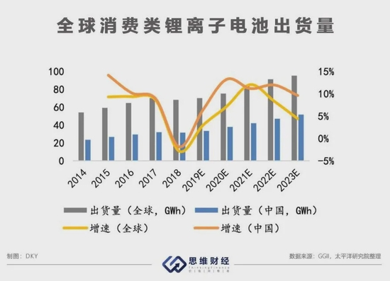 从市场整体看,消费类锂离子电池出货量增速放缓,2018年-2023年复合增速约为7%。其中,疫情带动笔记本电脑类产品需求增长。2020年全球笔电出货量达到2.23亿台水平,同比增长28.9%。但与之相反的是,手机出货量大幅缩减,2020年因疫情全球供应链停滞等因素,2020年全球手机出货量同比下滑5.76%,为12.92亿台。