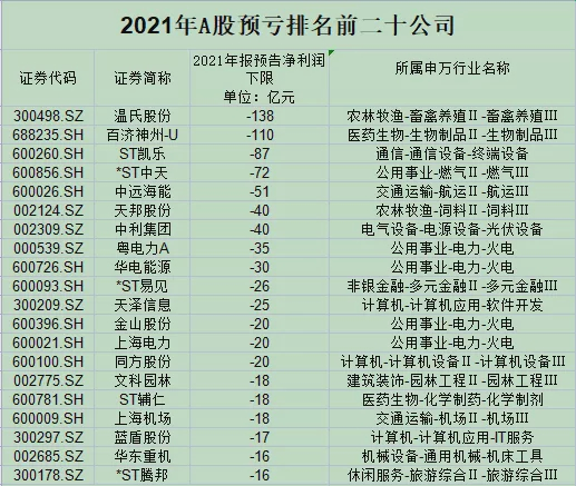 从行业来看,业绩预亏比较集中的是火电行业公司,前20大预亏排行榜中,火电股占据了4席,煤炭价格的上涨导致多家发电企业预亏超10亿元;生猪养殖企业同样不容乐观,受去年国内生猪价格下跌、饲料原料价格高企等因素叠加影响,生猪养殖深度亏损。