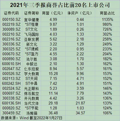 商誉规模占净资产比重过高的公司,更为危险。截至2021年三季度末,A股上市公司商誉合计1.26万亿元,商誉规模占净资产比例超过50%的上市公司共有66家。
