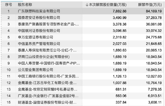 1月27日,中泰化学公告称,公司本次解除限售的股份为3.43亿股,占公司总股本的13.33%,可上市流通日为2022年2月10日。本次解禁限售的股东为14名,包括联塑科技、国泰君安证券、银河证券、申万宏源证券等。
