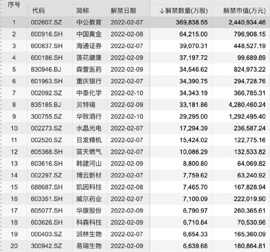 从解禁股数来看,居前三位的是中公教育、中国黄金、海通证券,解禁数量分别为36.98亿股、6.42亿股、3.91亿股。