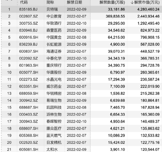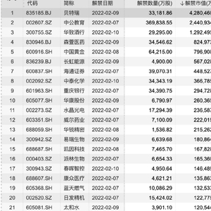 虎年开市第一周,A股市场将面临巨量解禁。数据显示,下周共有91家公司限售股陆续解禁,解禁市值为1570.81亿元,其中贝特瑞、中公教育、华致酒行3家公司的解禁市值超百亿元。