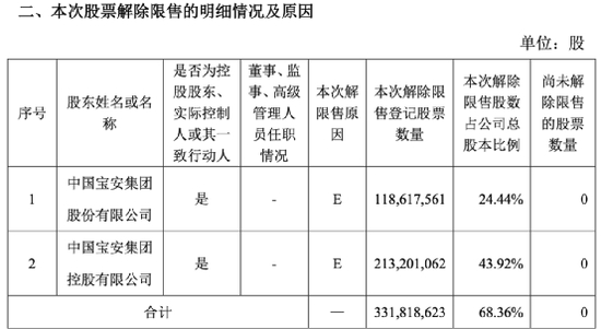 本次解禁的股东为中国宝安集团股份有限公司、中国宝安集团控股有限公司,所持股份为参与战略配售取得的股票,本次解除限售股数占公司总股本比例分别为24.44%、43.92%。