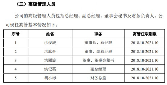 具体来看,公司董事长、总经理洪俊城与董事洪娜珊系夫妻关系,董事兼副总经理洪耿奇、重大项目办建设项目副总经理洪耿宇系洪氏夫妇之子,董事兼董事会秘书洪丽旋、总经办主任洪丽冰系洪氏夫妇之女,副总经理洪记英系公司董事长、总经理洪俊城之妹。另外持有少量股份的洪秀凤为洪俊城另一个妹妹洪乐英之女,也就是洪俊城的外甥女。