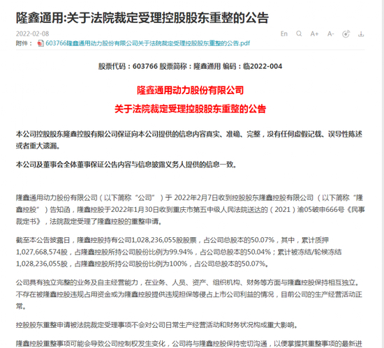 2月7日晚间,隆鑫通用发布公告称已收到关于法院裁定受理控股股东重整的告知函,隆鑫控股持有公司1,028,236,055股股票,占公司总股本的50.07%,其中,累计质押1,027,668,574股,占隆鑫控股所持公司股份比例为99.94%,占公司总股本的50.04%;累计被冻结/轮候冻结1,028,236,055股,占隆鑫控股所持公司股份比例为100%,占公司总股本的50.07%。