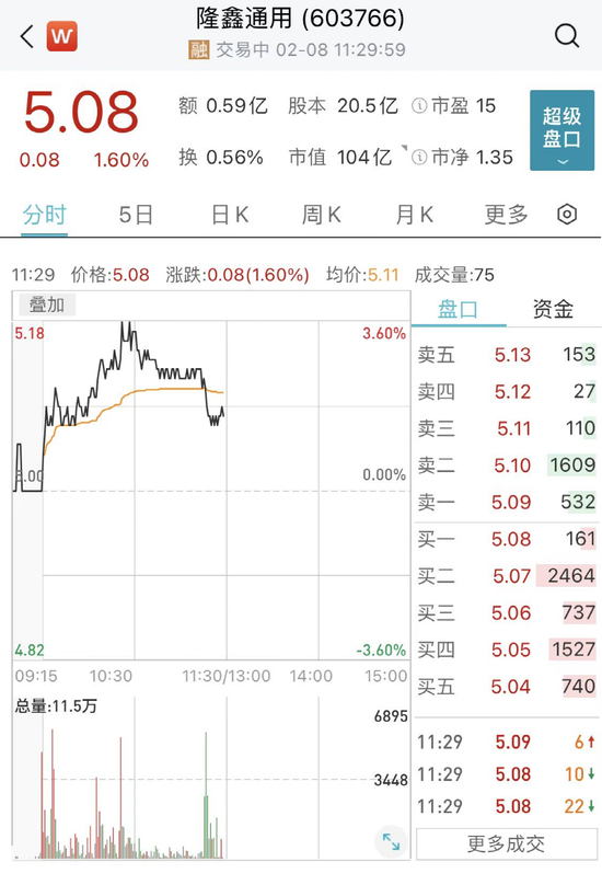 股价方面,截至2月8日午间收盘,隆鑫通用每股报5.08元,涨幅1.6%。最新市值为104亿元。
