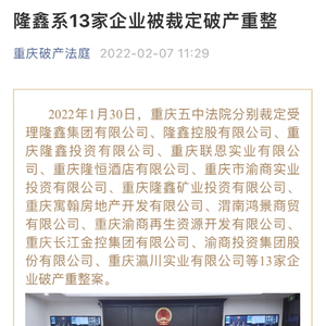 2月7日,重庆破产法庭宣布隆鑫系13家企业被裁定破产重整。