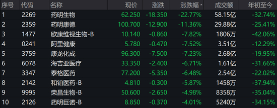 港股方面,药明生物(02269.HK)跌近23%停牌,药明康德(02359.HK)跌超11%,欧康维视生物-B(01477.HK)、阿里健康(00241.HK)、康龙化成(03759.HK)跌逾7%。
