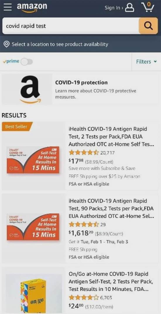 亚马逊网站在售的九安医疗新冠抗原家用自测试剂盒