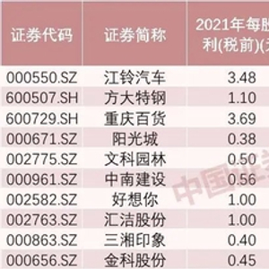以前述方式计算,2022年股息率靠前的还有方大特钢、重庆百货、阳光城、文科园林、中南建设、好想你、汇洁股份、三湘印象、金科股份等,其股息率从10%到14.25%不等。共有679只个股股息率有望超过2.11%,即超过余额宝最新的七日年化收益率2.107%。