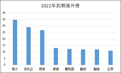 其中,碧桂园、恒大、佳兆业位列存量海外债规模前三甲,均超过百亿美元。2022年到期的海外债规模前三分别为恒大、佳兆业、绿地,均超过25亿美元,偿债压力不小。