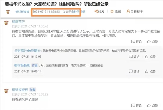 记者在股吧梳理发现,其实早在2021年7月份,市场就已流传有关金种子酒在接触投资入股的事情,也有投资者称可能是华润。