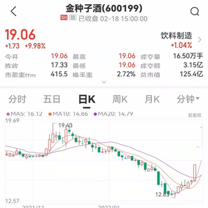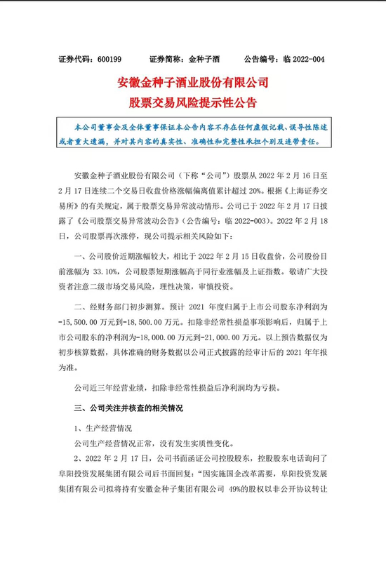 2月18日晚,金种子酒还发布公告称,目前公司生产经营情况正常,没有发生实质性变化。公司股价近期涨幅较大,相比于2月15日收盘价,累计涨幅为33.10%,短期涨幅高于同行业涨幅及上证指数,敬请广大投资者注意二级市场交易风险,理性决策,审慎投资。