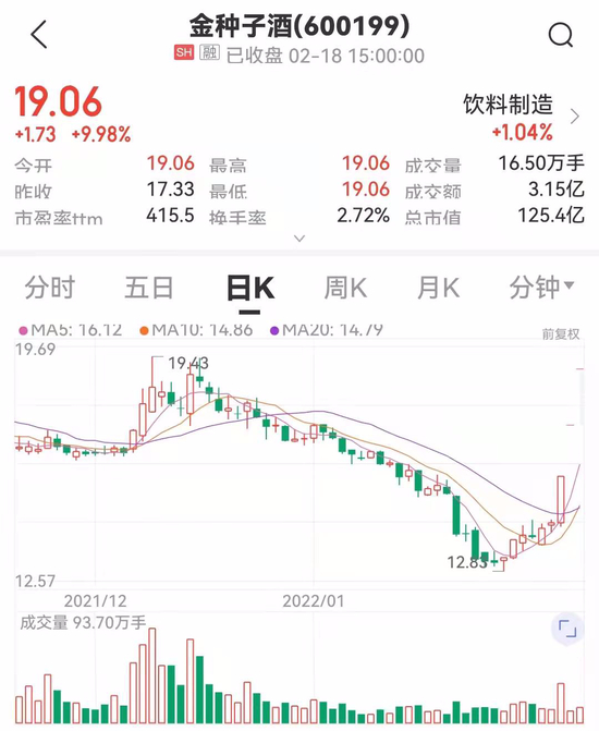 2月18日,金种子酒开盘再次强势涨停。过去三个交易日,金种子连续涨停。