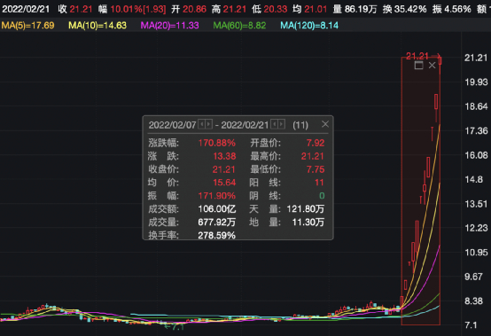 截至2022年2月21日收盘,公司收盘价格为21.21元,2022年 2月7日至21日,区间涨幅为170.88%,公司股价近期波动幅度大。