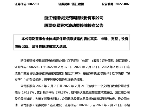 2月21日晚间,浙江建投公告,公司股票自2022年2月7日至2022年2月21日连续十一个交易日收盘价累计涨幅为170.88%,累计换手率为278.59%,期间多次触及股票交易异常波动。