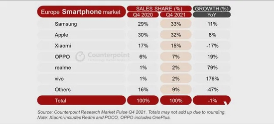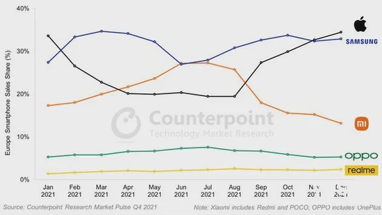 根据Counterpoint的数据,近期OPPO和小米在欧洲的市场份额都有下滑。OPPO稍好一些,2021年四季度同比2020年四季度仍然是上涨的。小米的数据更惨烈,不仅环比跌幅惊人,甚至四季度还出现了同比下滑。