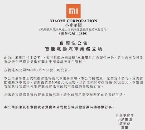 2021年3月30日,小米集团公告,公司拟成立一家全资子公司,负责智能电动汽车业务。首期投资为100亿元人民币,预计未来10年投资额100亿美元。本集团首席执行官雷军将兼任智能电动汽车业务的首席执行官。