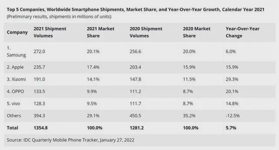 2022年1月底市场调研机构IDC、Counterpoint Research等先后出炉了2021年国内智能手机出货量排名以及Q4季度的出货量排名。