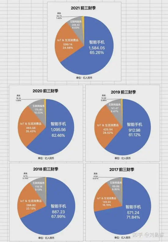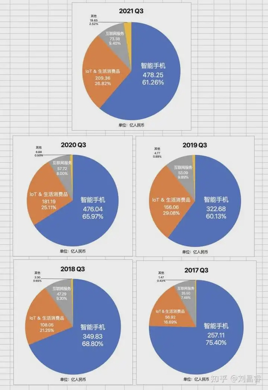 单看Q3同比,那么智能手机占比从2020Q3的66%降至61.3%,接近2019Q3水平,“IoT& 生活消费品”;目前看来成效非常显著,2021Q3相比于2017Q3,已经增长到了四年前的3.68倍!营收也突破了200亿人民币,这其实是在向更健康的方向发展,前三财季其实更能说明问题,智能手机占比从2020Q1-Q3 的62.5%反弹至65.3%,为近三年最高,互联网服务品类占比甚至出现了下滑,由10%降至8.63%。