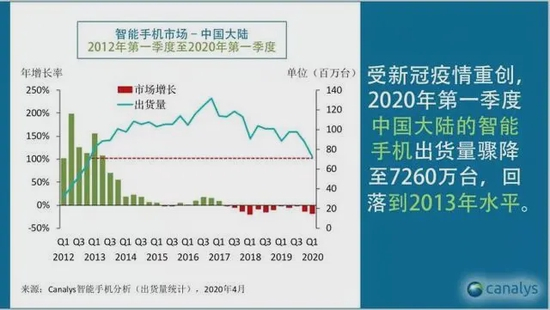 图为Canalys统计2012Q1-2020Q1中国智能机市场出货量表现(8)