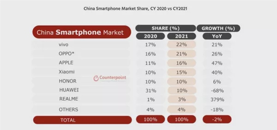根据市场调研信息来看,vivo以22%的市场份额正式登顶。虽然2021年vivo并未推出旗下最高定位的NEX系列新机,不过凭借X系列、微云台设计等取得了不俗的销量,尤其在线下市场备受青睐。OPPO则以21%的市场份额紧随其后位列次席,同比增长达到26%,无论是线下市场,亦或是线上机型,2021年较为稳健的市场策略是OPPO取得成绩的主要原因。