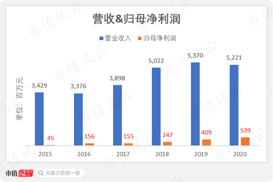 公司的业绩表现颇为亮眼。2015-2020年,公司营收从34亿元增至52亿元,归母净利润从4500万元增至5.4亿元。