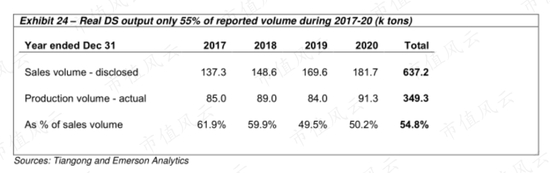 总的来说,做空机构认为:2017-2018年,公司模具钢的真实产量约为财报披露销售量的60%,这一比例在2019-2020年进一步下降到50%。