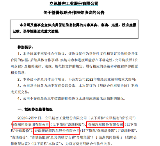 而在2月11日,立讯精密发布公告称,公司与奇瑞控股、奇瑞股份、奇瑞新能源共同签署了《战略合作框架协议》,正式成为战略合作伙伴。