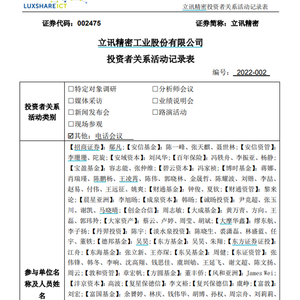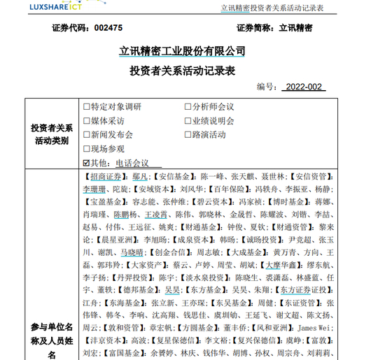 2月22日晚上9点至10点半,立讯精密通过电话会议的形式接受161家机构调研。其中基金管理公司82家,资产管理公司27家,投资公司21家,保险资产管理公司11家,其中包括嘉实基金归凯,睿远基金傅鹏博,交银施罗德基金何帅、博时基金肖瑞瑾等高知名度基金经理。