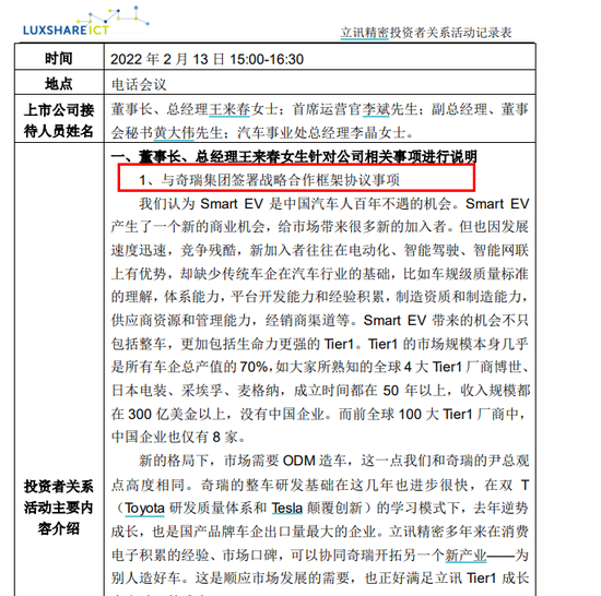 而在此次调研中,调研各方围绕在立讯精密和奇瑞的关系上展开了提问,包括选择和奇瑞合作的原因、模式,新设立的合资公司的主要客户、市场优势,以及大股东购买奇瑞的原因、后续安排等。