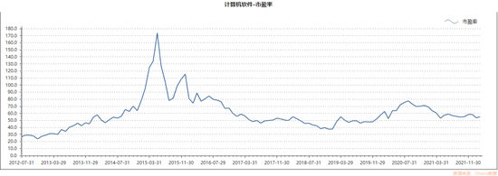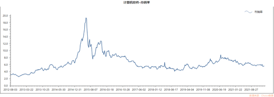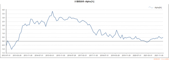 横向看,计算机软件板块在当前时间段也处于估值的低位。虽然在2020年中旬,软件板块估值有所提升,但从板块α来看(以上证综指为基准参考),却与估值增长形成了背离的形态,这意味着,当时整体市场估值是呈现上涨趋势,而计算机软件板块自身带来的α收益并不理想。甚至在板块估值回调阶段,即2021年3月末带来了负的α收益。