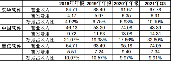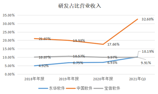 从研发投入金额看,3家同行业公司中,中国软件研发投入较高且增长趋势明显,19年之后的研发投入均超过10亿元;宝信软件的研发投入虽然不及中国软件,但是增速依旧很明显,而且2018年开始研发投入就高于东华软件,在2020年更是在营业收入上全面赶超了东华软件。