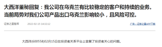 大西洋也有对乌克兰的相关出口。大西洋回复投资者称,“公司在乌克兰有比较稳定的客户和持续的业务,当前局势对我们公司产品出口乌克兰影响较小,且风险可控”。