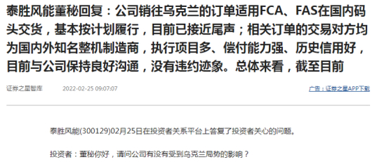 关于公司在乌克兰项目的情况,泰胜风能在互动平台上表示,截至目前,乌克兰局势对公司生产经营活动没有重大影响。公司正持续关注当地局势,与客户保持沟通,积极防控可能发生的风险。