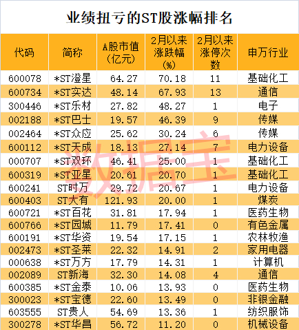 数据宝统计,从二级市场表现来看,2月以来上述52只业绩扭亏的ST股平均涨幅为10.36%,超出同期沪指6个百分点以上。*ST澄星、*ST实达、*ST乐材、*ST巴士、*ST众应等5股期间涨幅30%以上;*ST澄星累计涨幅70.18%居首,该股春节至今累计收获11个涨停板,有78.6%的交易日为涨停状态。因股票近期累计涨幅较大,期间多次触及股票交易异常波动,*ST澄星目前处于停牌状态。