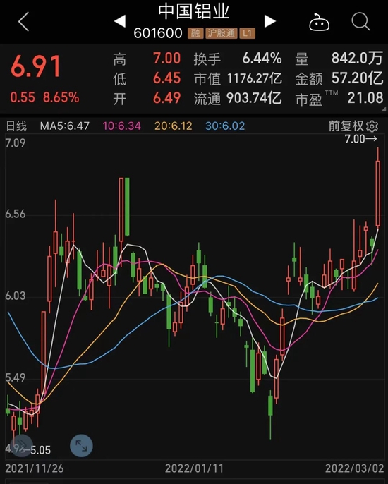 宁德时代、中国铝业、隆基股份的成交额超50亿,排在前三位。新能源题材市值第一股宁德时代收盘跌幅4.17%,最新A股市值跌破1.2万亿。中国铝业大涨8.65%,全天成交额57.2亿元,该股盘中一度涨停。与铝材相关的丽岛新材、罗普斯金、宁波富邦收盘涨停,神火股份、云铝股份、天山铝业等涨超5%。隆基股份收盘时股价平盘。