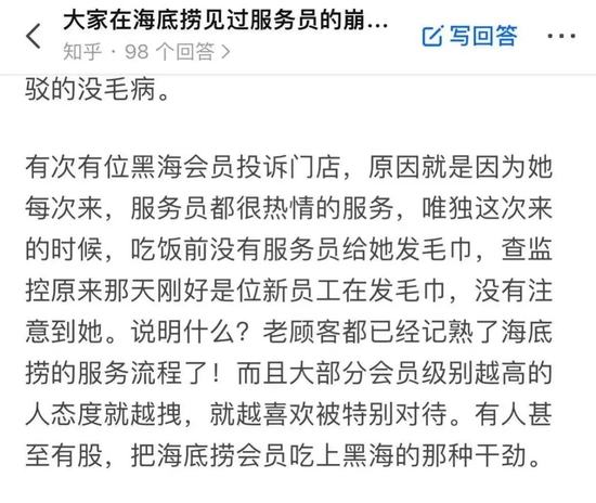在知乎上吐槽客诉的前海底捞员工 图源:知乎截图