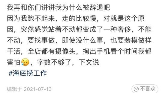 很多刚入职的年轻员工们不能理解,为什么一定要小跑。小红书上,有海底捞离职员工吐槽自己因为跑不动,走了几步就遭到了经理的指责。