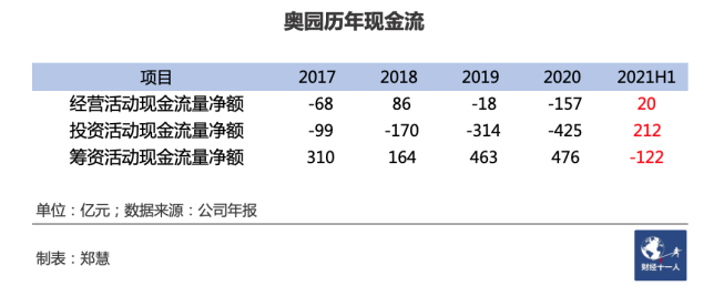 现金流量表显示,2021上半年,奥园经营活动现金净流入20亿元,投资活动净流入212亿元,而筹资活动净流出122亿元。较往年变化明显。
