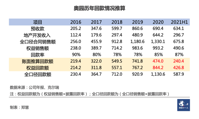 从下表可以看出,2020年与2021上半年,综合奥园权益销售额与回款率,得出的回款金额,与报表数值推算的结果差异较大。