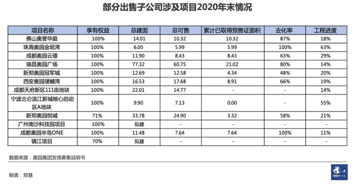 奥园集团的发债资料显示,截至2020年底,多家出表公司所涉及的地产项目,奥园享有的权益仍为100%。