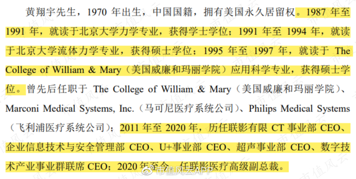 公司的高级副总裁黄翔宇,本硕均就读于北京大学力学专业,曾任职于飞利浦。