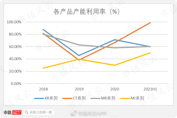 不过,截至2021年上半年,联影医疗只有CT系列产品的产能利用率较高,其余系列产品的产能利用率均在60%左右。