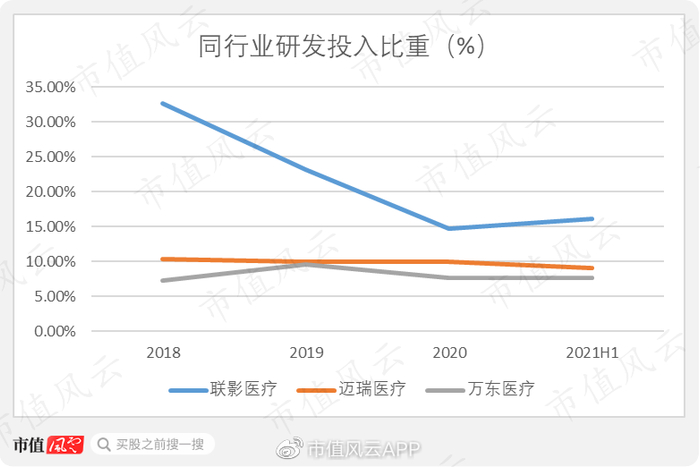 与同行业相比,联影医疗研发投入的比重(研发投入/营业收入)也毫不逊色。在此,风云君选择了迈瑞医疗和万东医疗与之进行对比。
