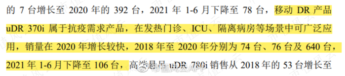 其中,移动DR产品uDR370i为抗疫需求产品,主要应用于发热门诊、ICU、隔离病房等场景,与疫情直接相关。其销量由2020年的640台,下降至2021年上半年的106台。