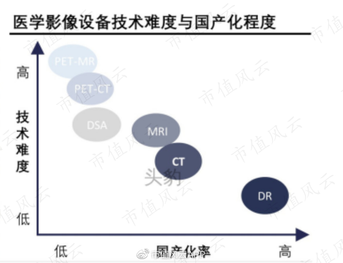 比如:出现较早的X射线诊断,技术难度低,国产化程度高;而新兴的分子影像技术,如PET-CT、PET-MR(正电子发射计算机断层扫描)等,则技术难度高,国产化程度较低。