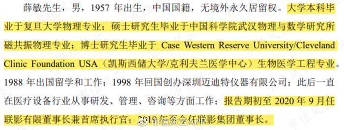目前,薛老板是控股股东联影医疗技术集团有限公司(简称“联影集团”)的董事长。