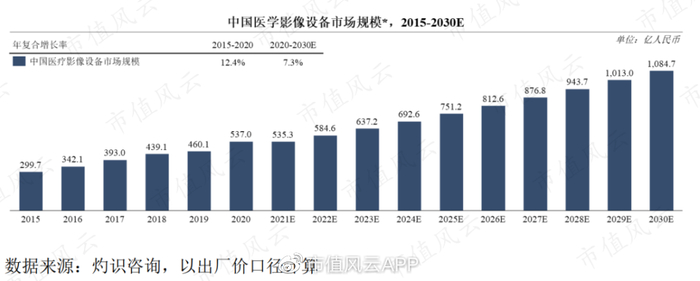 2020年,我国医学影像设备市场规模为537亿,2015-2020年期间的年均复合增长率达12.4%。预计至2030年,年均复合增长率为7.3%。